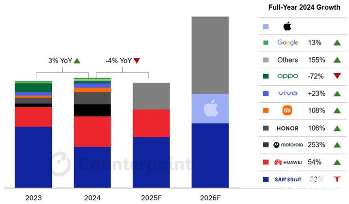 2024年,三星折叠屏手机出货量位列第一,但同比下落33%;华为位列第二,同比增长54%;摩托罗拉位列第三,同比增长253%;荣耀位列第四,同比增长106%;小米位列第五,同比增长108%;vivo位列第六,同比增长23%;OPPO位列第七,同比下落72%。 近日,盛名阛阓调研机构CounterPoint Research发布了2024年群众折叠屏手机阛阓研报,2024年群众折叠屏手机出货量仅同比增长2.9%,增速大幅放缓,预测2025年将初次出现个位数负增长。 细节方面,2024年,三星折叠