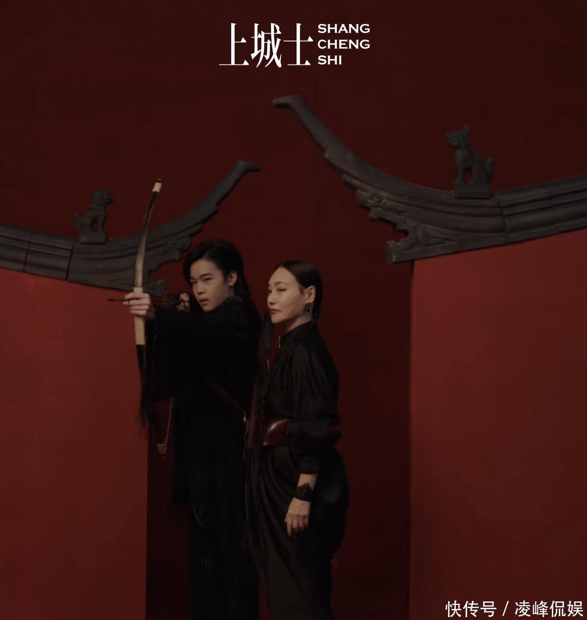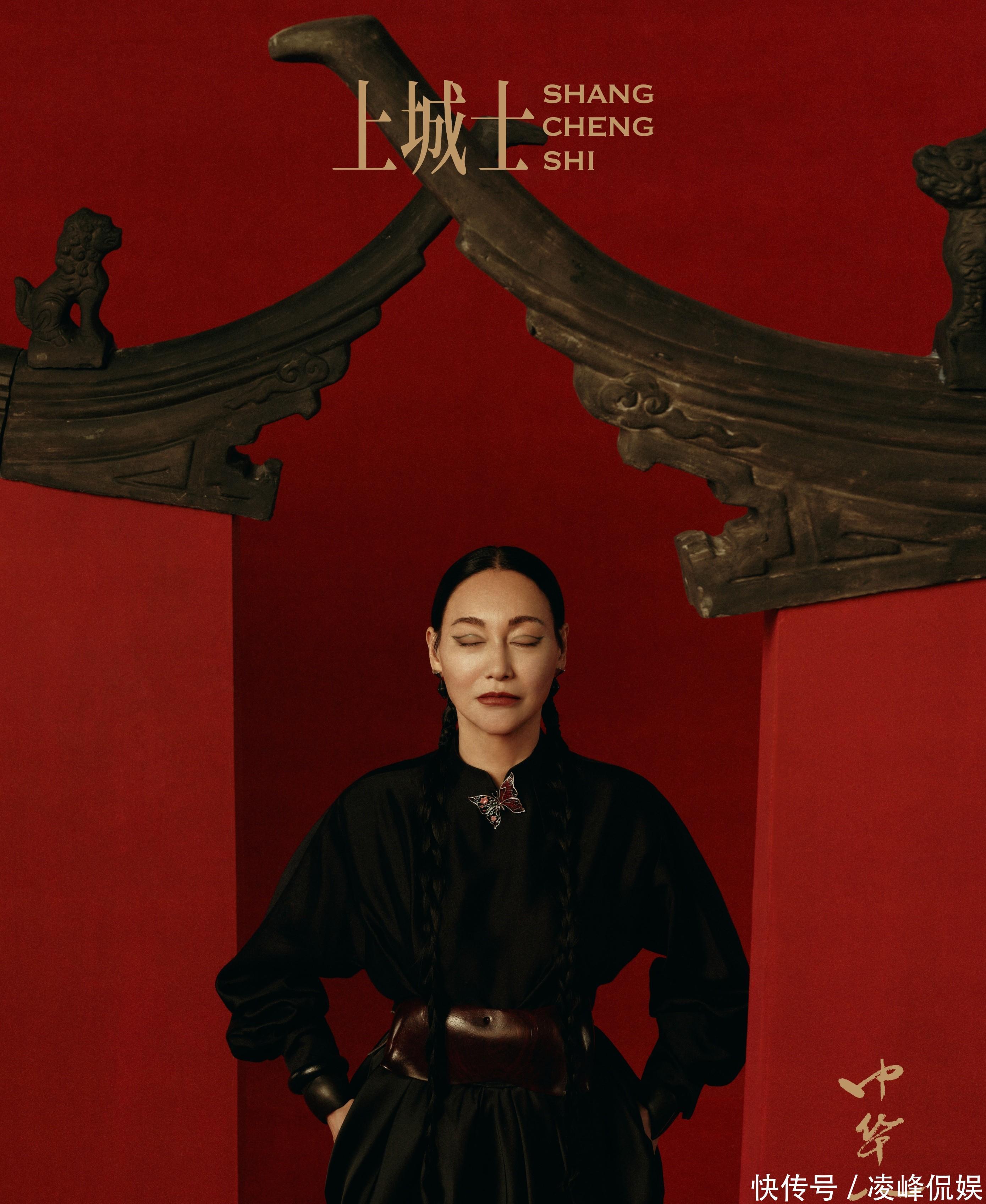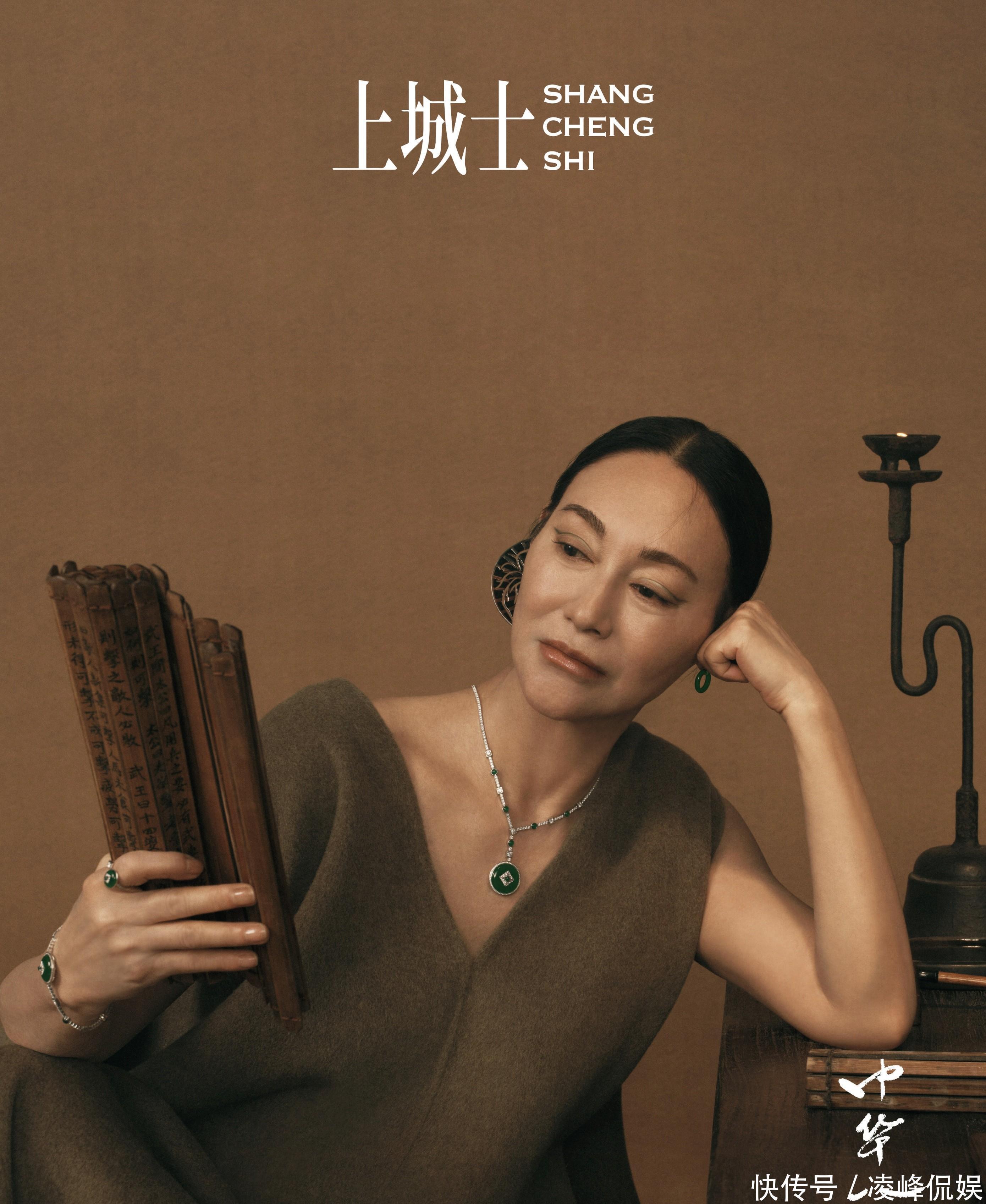 主咖是金像、金马影后惠英红。65岁的红姐风仪依旧,一张单封里,她一稔咖色的宽松连衣裙,一手扶额,一手拿竹简,看上去缓慢淡定。